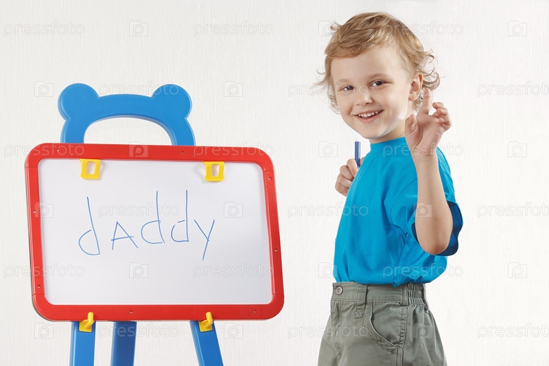 Маленький милый мальчик пишет слово "папа" на доске