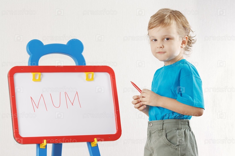 Маленький милый мальчик пишет слово "мама" на доске