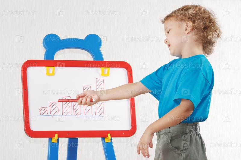 Маленький довольный мальчик нарисовал диаграмму на доске
