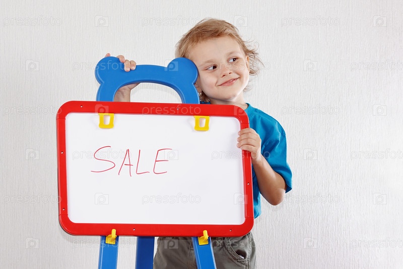 Маленький белокожий мальчик показывает слово 'продажа' на доске