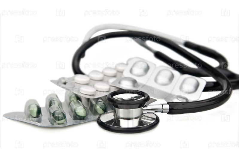 Стетоскоп и таблетки на белом фоне