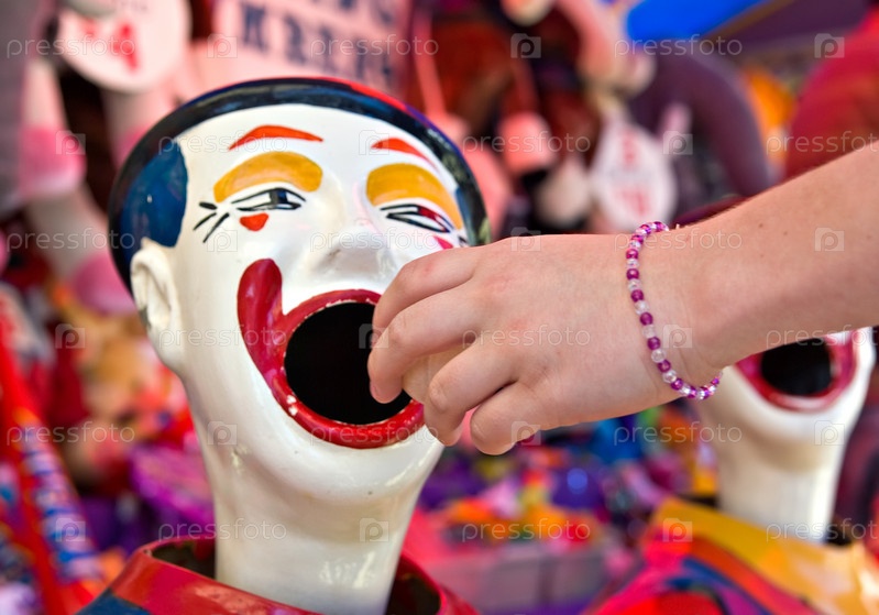 Аттракцион - человек ложит мяч в рот клоуну