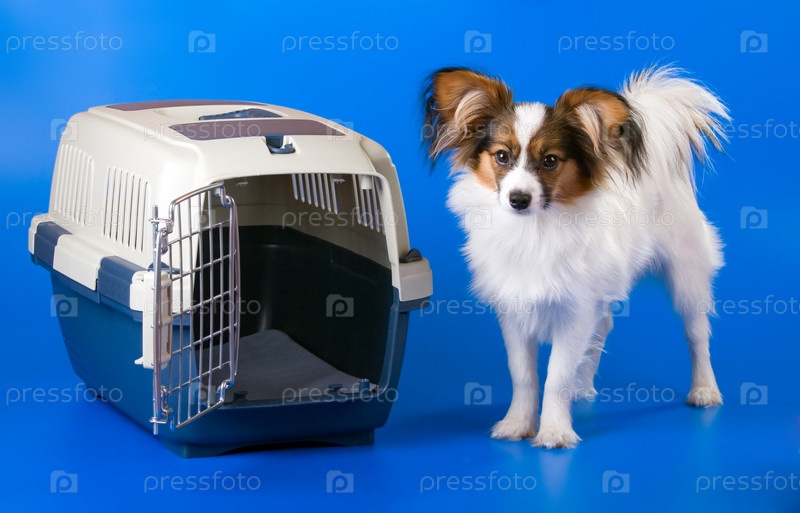 Собака породы папильон стоит рядом с переноской