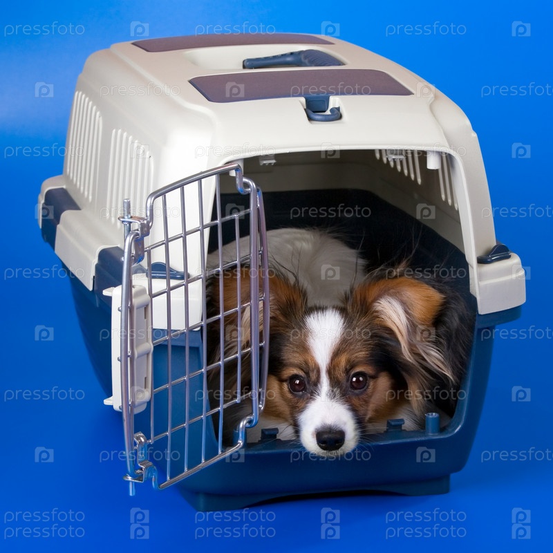 Собака породы папильон сидит в клетке