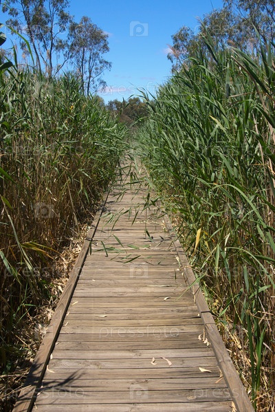 Длинная дощатая дорожка через камыши в болоте