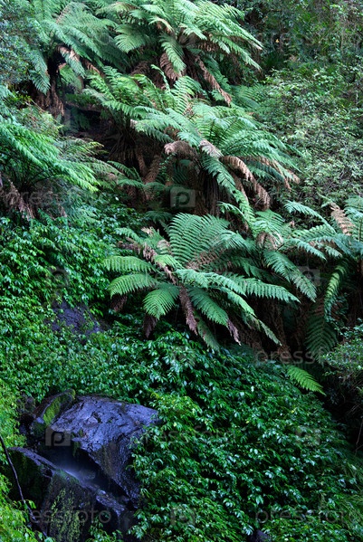 Папоротники, растения, камни в густом тропическом лесу Всемирного наследия Оксли во влажный день