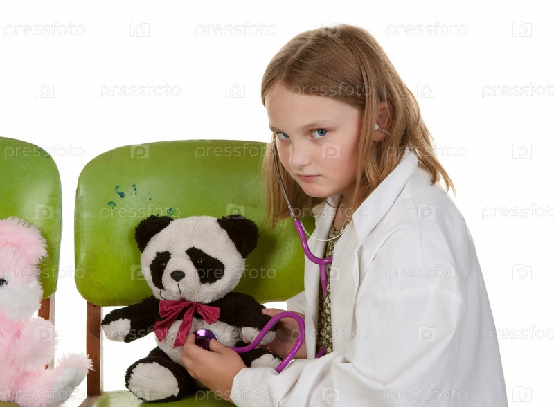 Девочка играет в докотора с мягкими игрушками