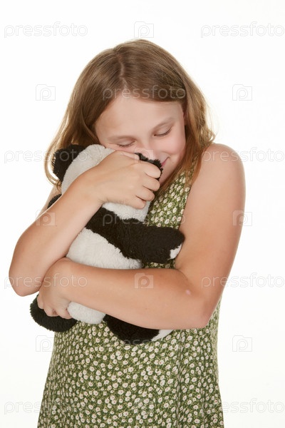 Девочка обнимает плюшевого медведя