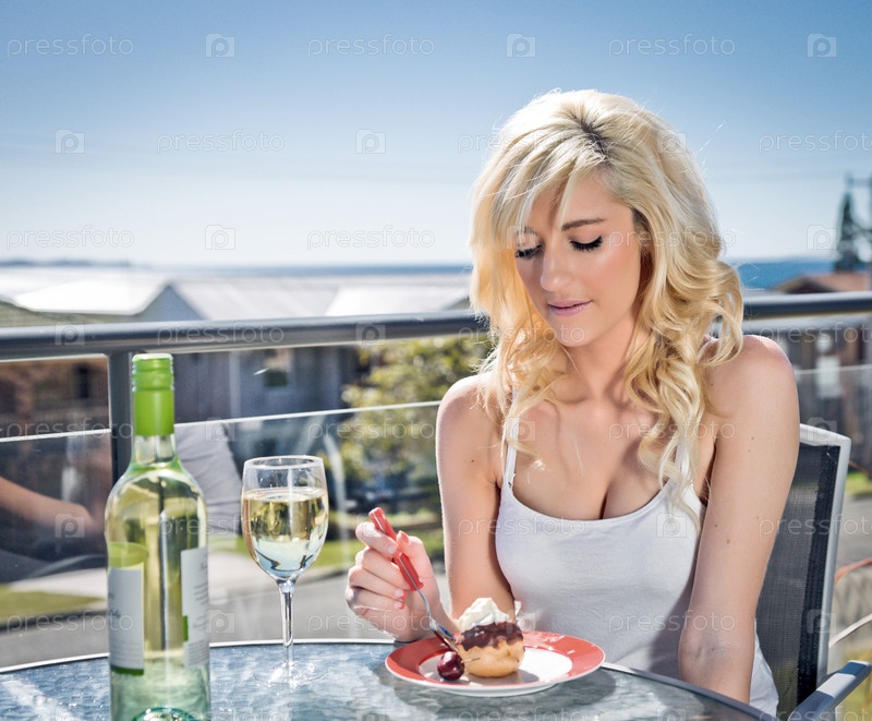 Молодая женщина ест десерт и пьет вино в кафе