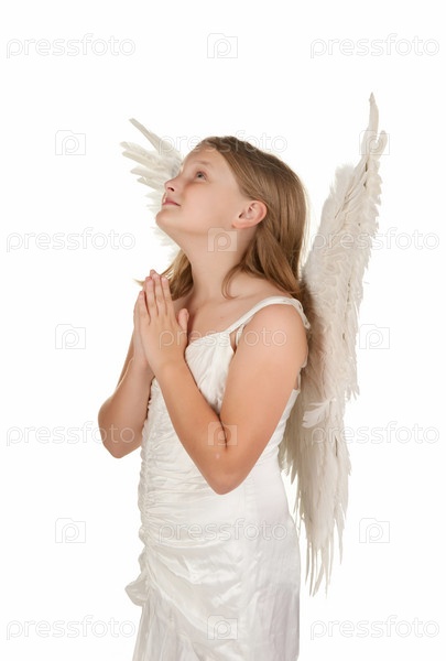 Девочка с ангельскими крыльями молится на белом фоне