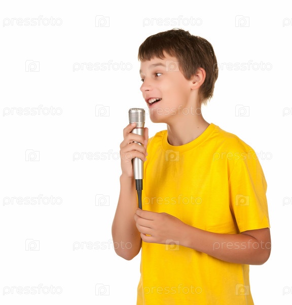 Мальчик-подросток говорит в микрофон