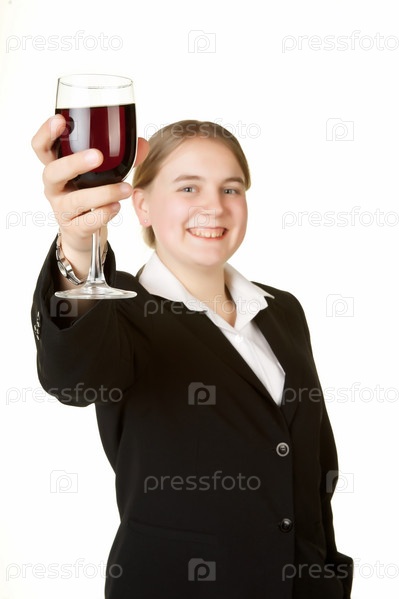 Бизнес-леди с бокалом вина на белом фоне