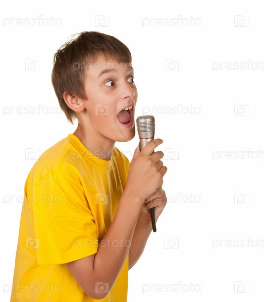 Мальчик-подросток поет караоке в микрофон