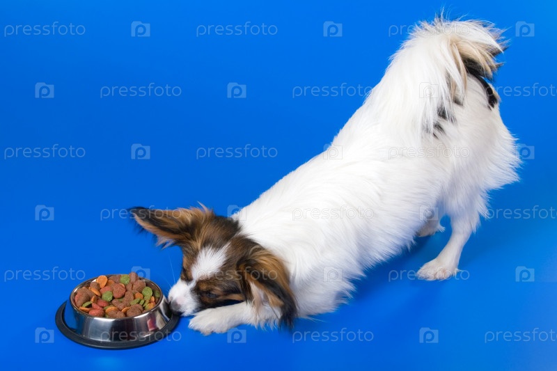 Собака с миской на голубом фоне