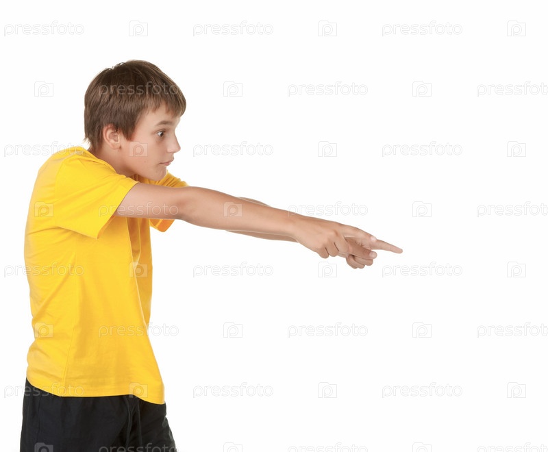 Мальчик показывает на что-то на белом фоне