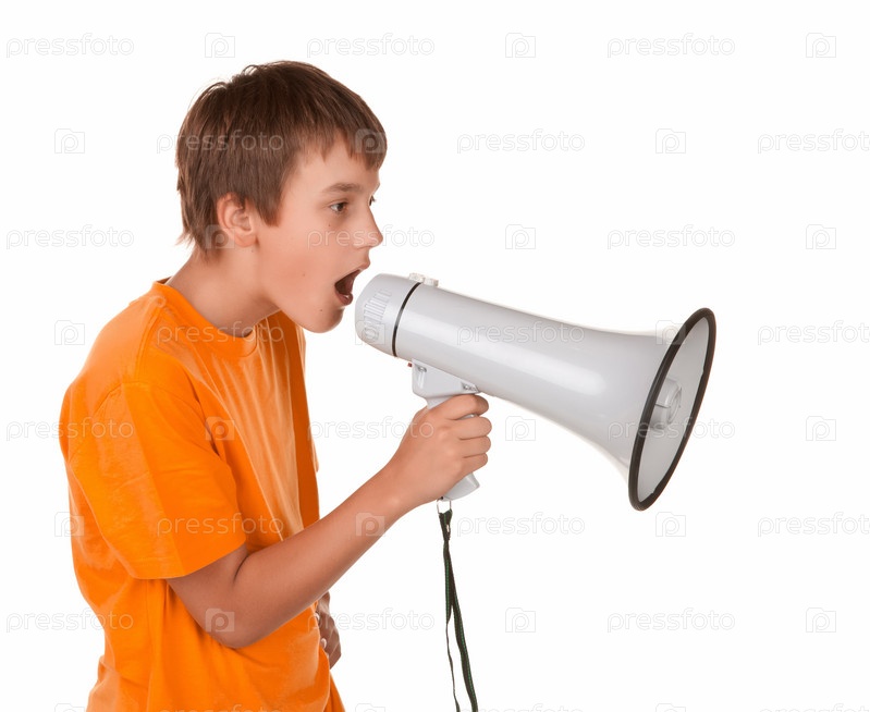 Молодой мальчик кричит в мегафон