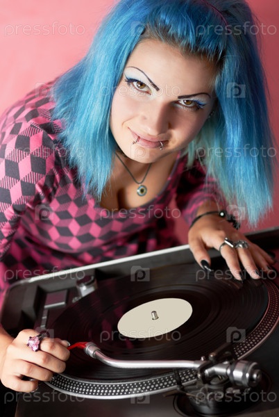 Девушка с голубыми волосами в стиле "манга" играет музыку на профессиональном оборудовании