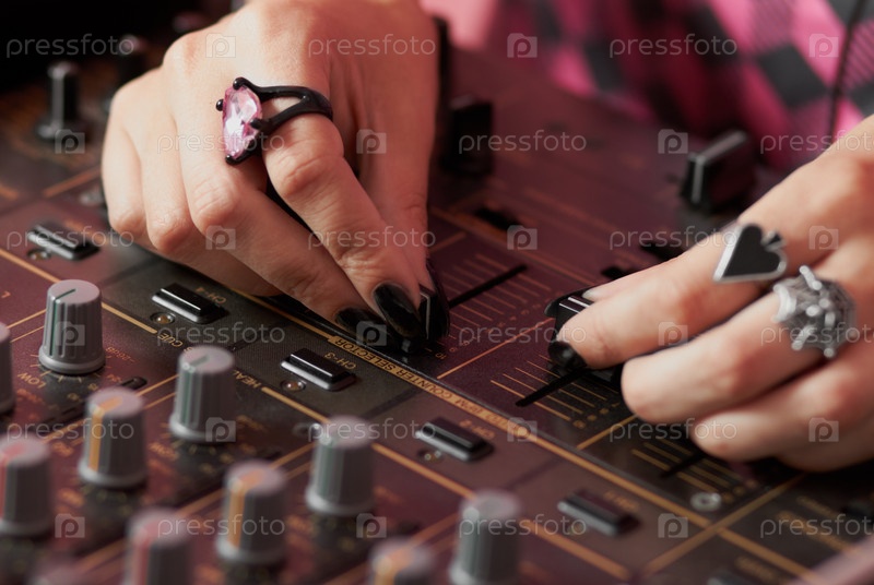 Руки женщины диджея играют музыку на профессиональном проигрывателе