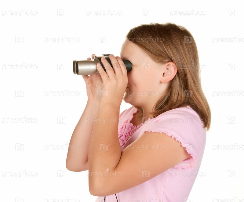 Девочка смотрит в бинокль на белом фоне