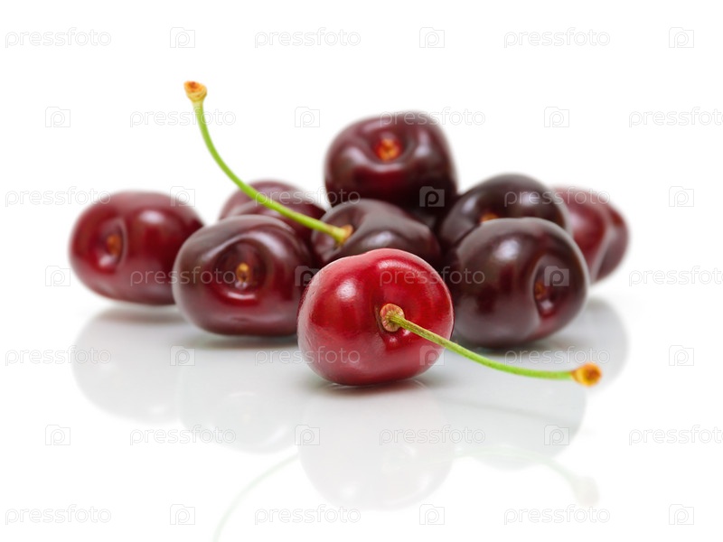 Спелые вишни крупным планом на белом фоне с отражением
