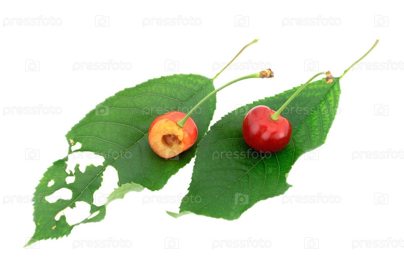 Целая и надкусанная вишни на зеленых листьях