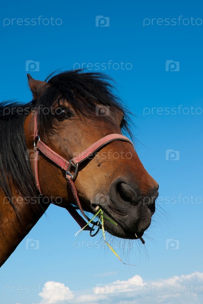 Голова лошади, жующей траву на фоне неба