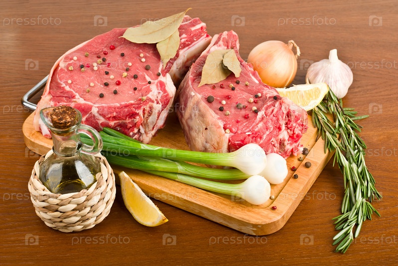 Сырое мясо на деревянной доске с овощами