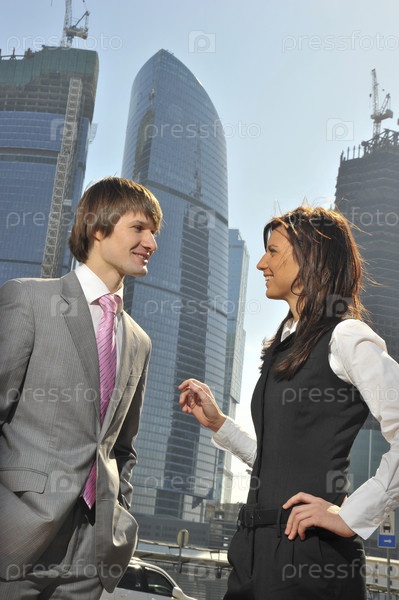 Успешные мужчина и женщина ведут разговор на фоне небоскребов