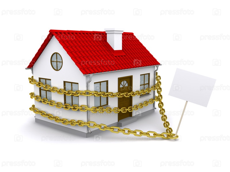 Дом со знаком и золотой цепью, изолированный на белом фоне