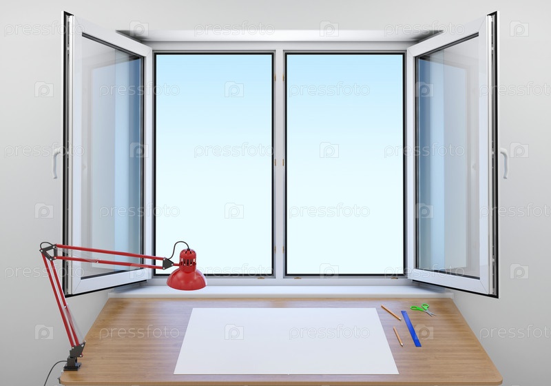 Стол возле открытого окна. Белый лист бумаги и канцелярские принадлежности