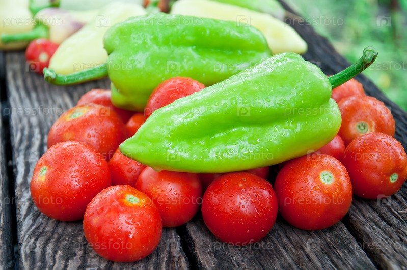 Перец и помидоры на деревенском деревянном столе