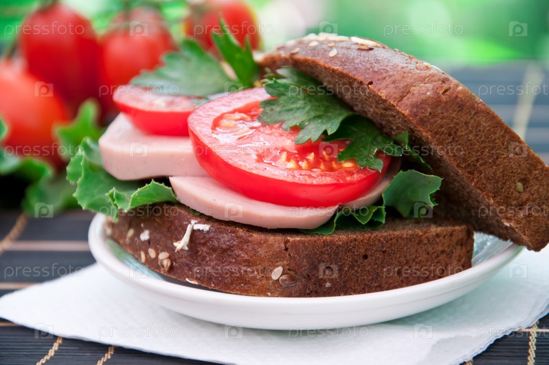 Бутерброд с помидорами, ветчиной и зерновым хлебом