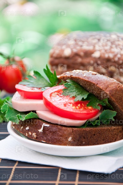 Бутерброд с помидорами, ветчиной и зерновым хлебом
