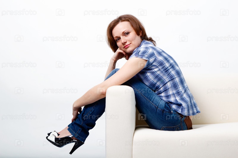 Девушка в клетчатой рубашке и джинсах сидит на диване