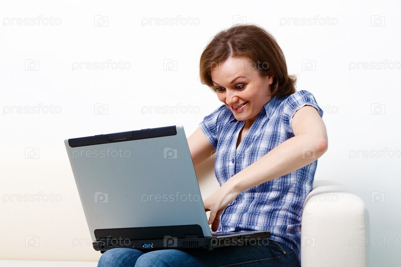 Смешная девчонка в клетчатой рубашке и джинсах с ноутбуком