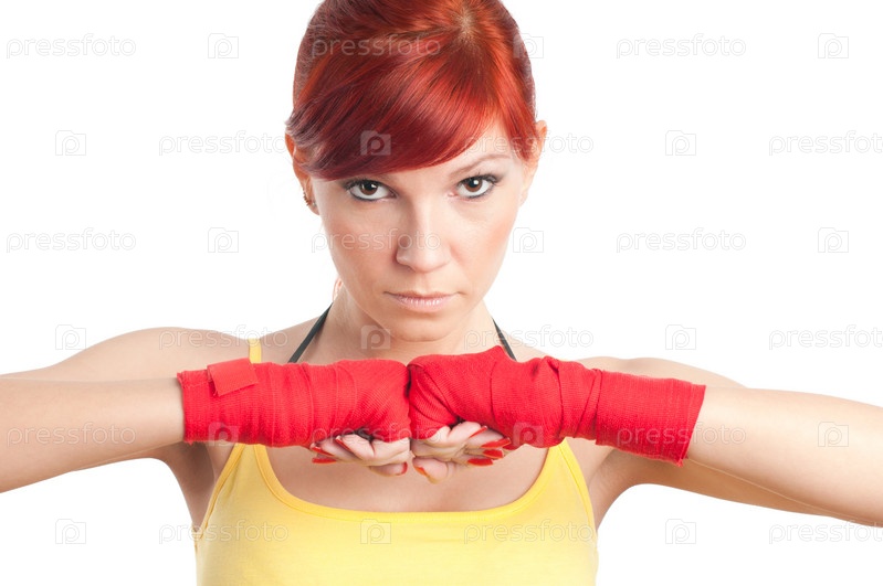 Рыжеволосая женщина-боксер в оборонительной позиции, белый фон
