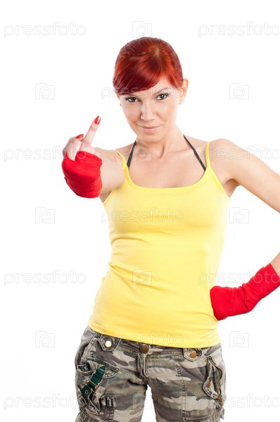 Спортивная молодая женщина в боксерских бинтах показывает средний палец в камеру