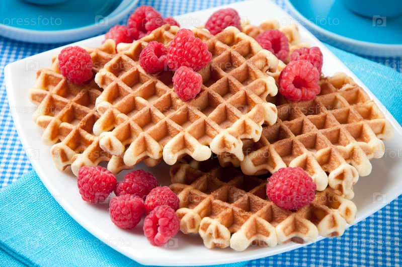 Домашние вафли с малиной, крупный план