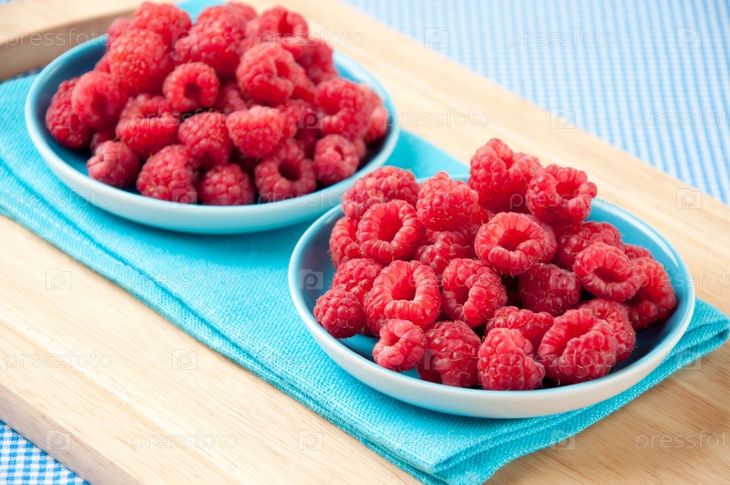 Два блюдца со свежей малиной