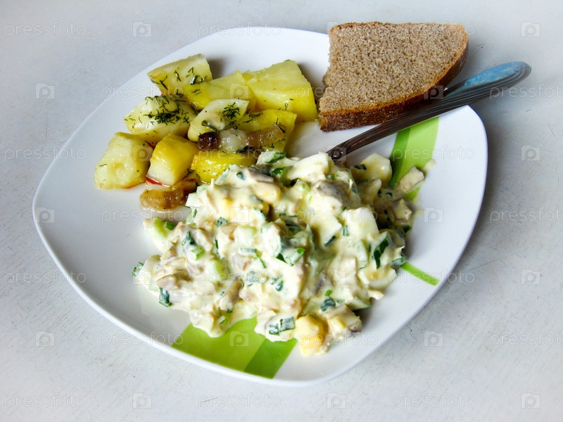 Блюдо из картофеля и салат с куском хлеба