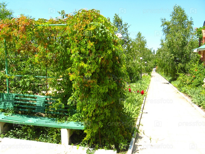 Красивый парк с кустами, деревьями и дорожкой