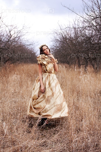 Принцесса в золотом платье в лесу