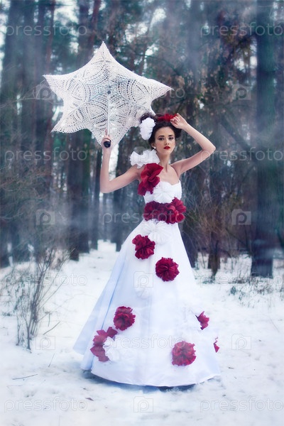 Красивая девушка ходит в снегу с зонтиком