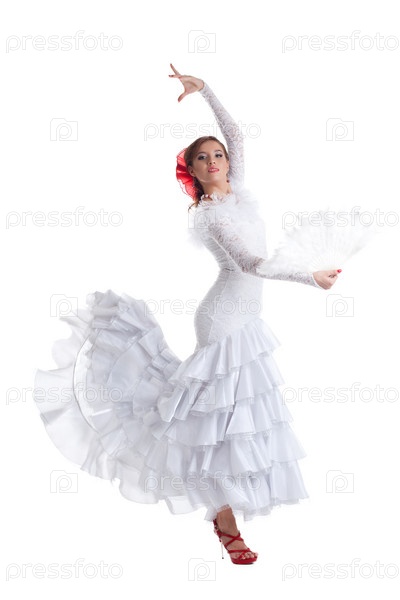 Женщина позирует в белом костюме фламенко