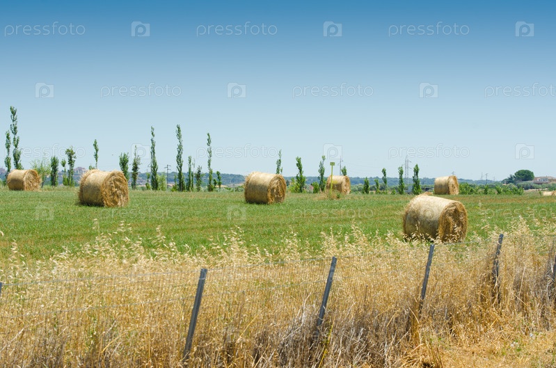 Поле с рулонами сена в летний день