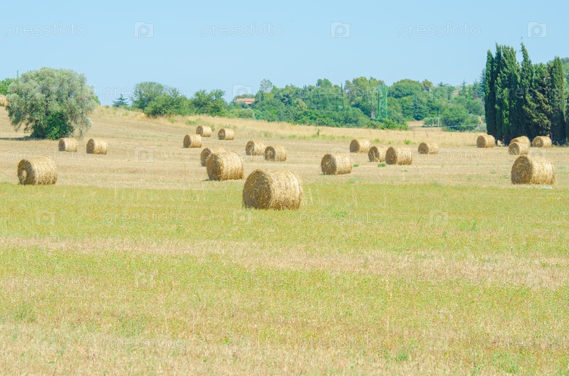 Поле с рулонами сена в летний день