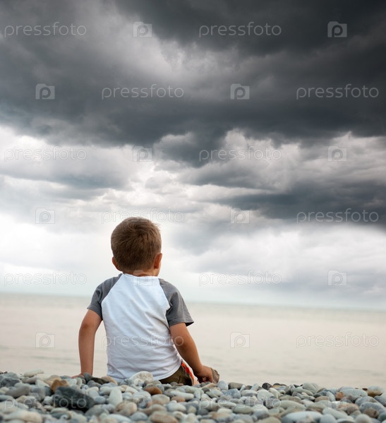 Мальчик сидит на пляже и смотрит на грозовые облака