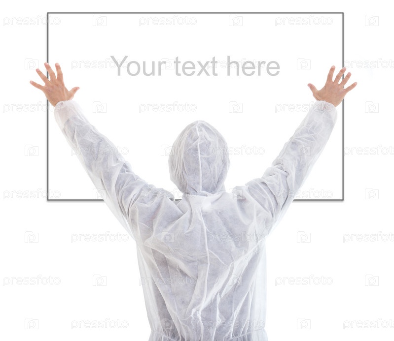 Человек в белой одежде перед пустым баннером