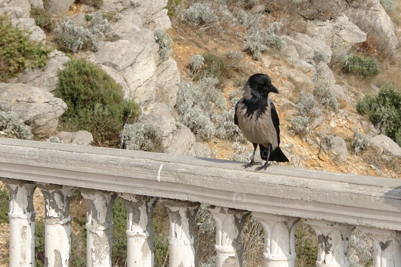 Птица на перилах на фоне гор