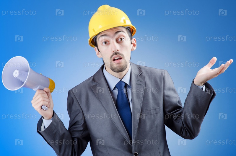 Бизнесмен в шлеме с мегафоном
